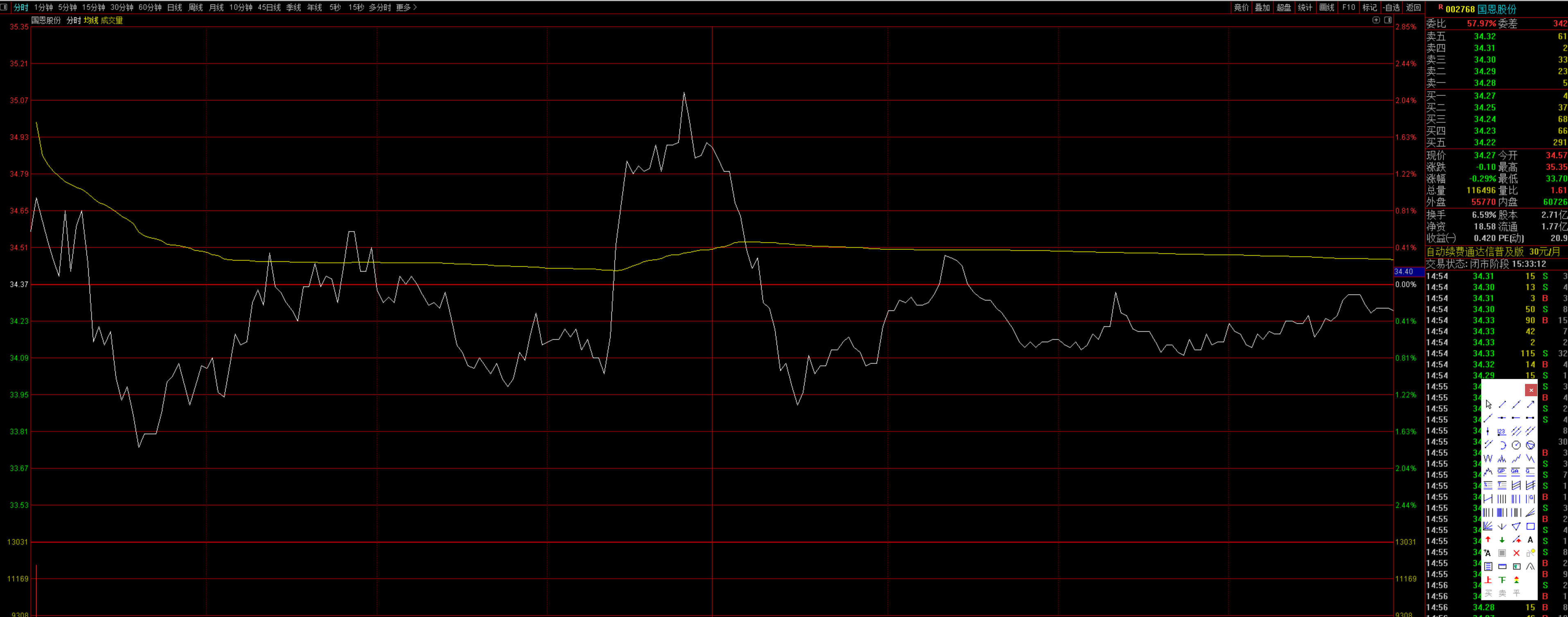 就在下跌的那个最低点,把我洗出局了,在下跌的时候,直接就下去了,今天早盘是跳空高开的,然后就开始直接往下砸,到33.81那里其实我并没有卖,只是图中没有显示而己,在那里出现了一个横,在当时的那里,那个还在往下跌,然后又恢复,并且盘口那个最低价,当时应该不止那里,估记是网络问题,不论怎么说,把我洗出来了,以盈利5%左右,终结了这次交易,然后慢慢又拉上去,这期间其实没什么大太看点,如果在下午盘那个急跌中,是洗不出来我的,因为他离我的止蚀标准,还是有很远的距离,对于这只股票,我只能说,我的标准只能让我盈利这么多,因为在交易市场一定要有自己的一套票准,买入卖出都要有票准有计划,这样才能做到风险可控,只有这样做才能区别于赌徒,在这个变幻莫测的市场一定一定是不能去赌的。