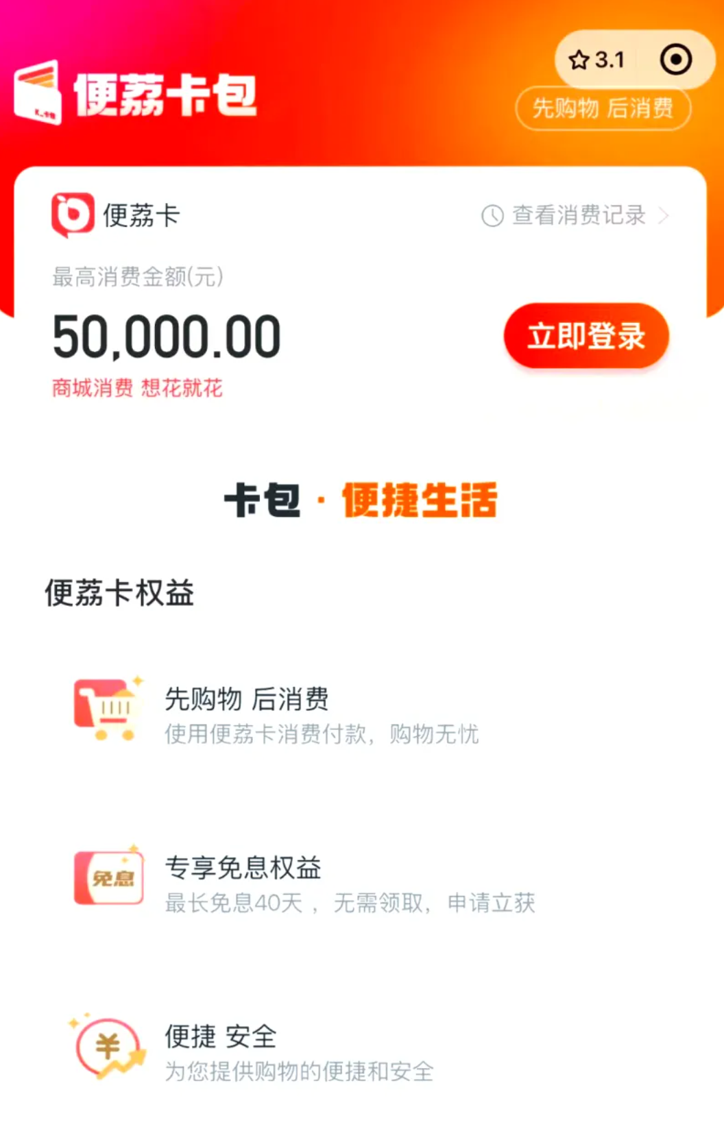 该产品最高可申请授信额度为30000元,购物额度最高为50000,信用好的用户平台还会追加临时额度,之前还遇到过30w的,还有10w的,只是这种超级大额的便荔卡购物额度非常的少,使用周期最长可达12个月,常见使用周期为6个月。申请流程简便,需提交个人身份认证和人脸识别,并完善个人基础资料。