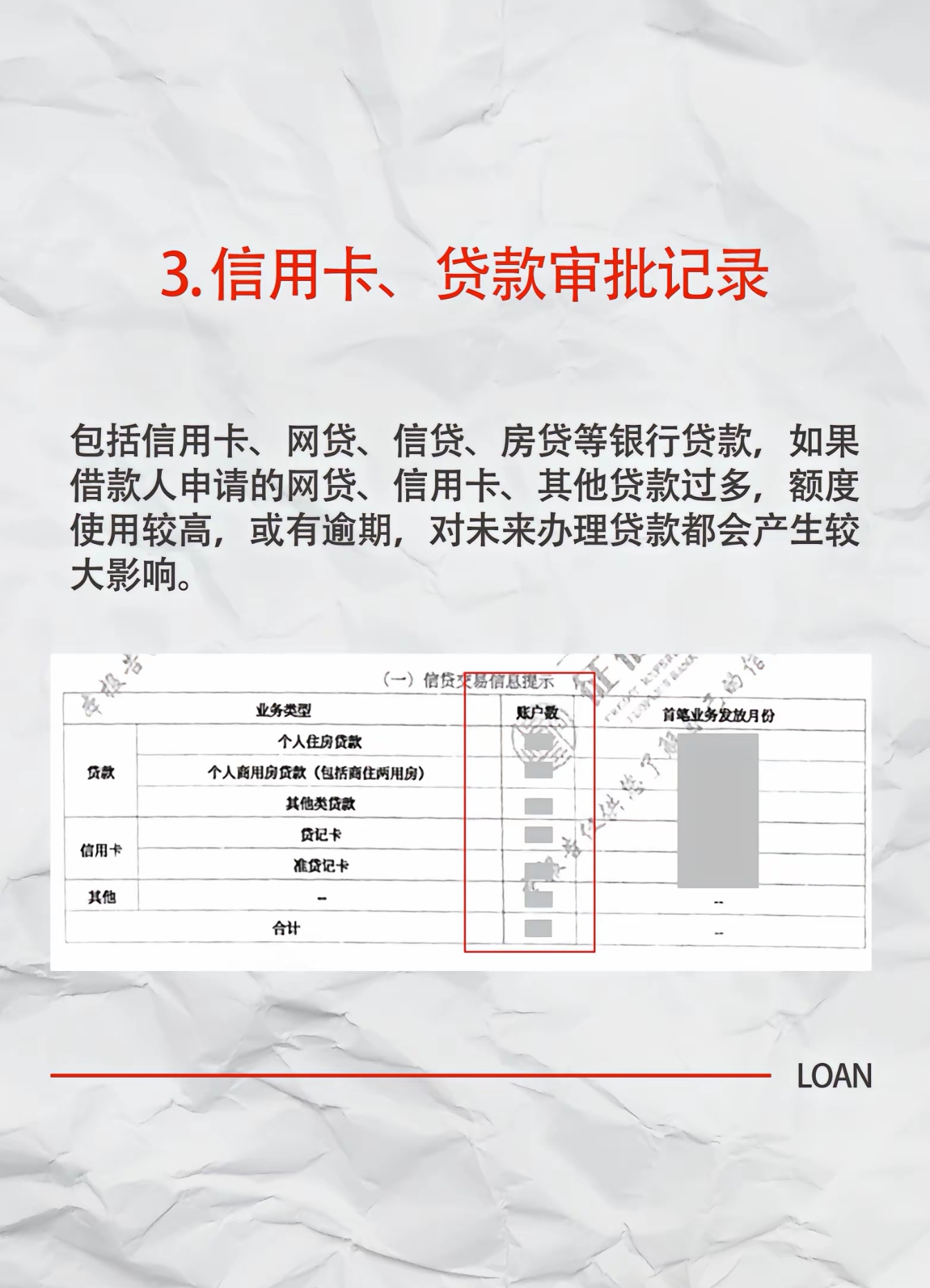 通过查看信用报告末端的征信查询记录,如果客户最近1-3个月内征信查询次数过多,说明客户在这一段时间内一定有做贷款或者信用卡,信贷人员要相对谨慎。