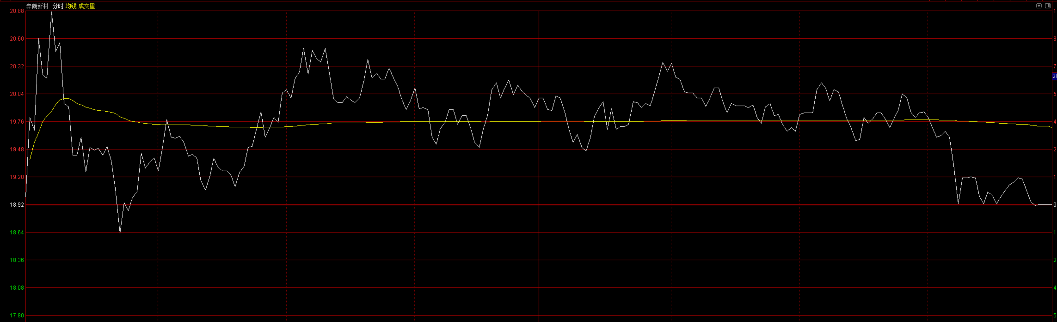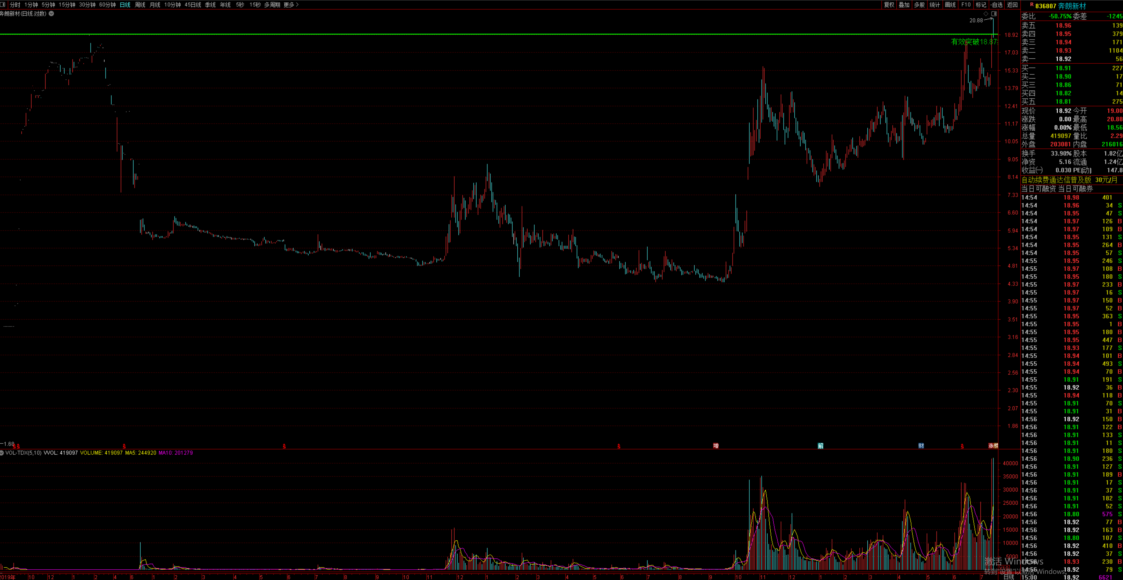 上图是奔朗新材的日线,在我个人看来,我做股票不是每天都在买卖,只有趋势形成了,才会去买,等趋势上涨完结那么就会出掉,以获取中间的利润,这个形态从上图可以看的出来,是突破了历史最高点18.87,这个是在日间波动突破的,并且底部放量,也是放的非常大,可以说这个量为这只股票有史以来最大量,而且放的非常的漂亮,那我们来看看日间波动。